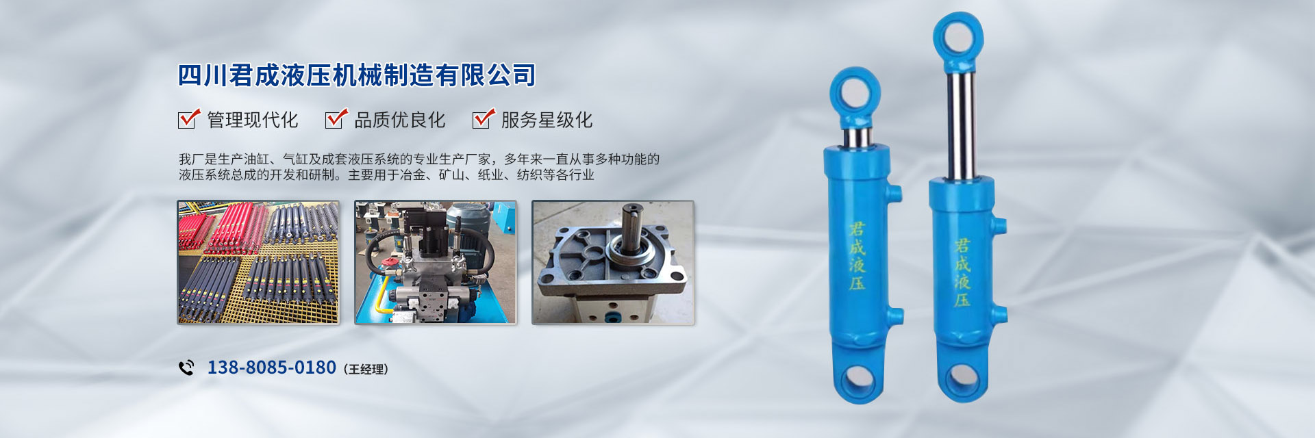 公司主導產品:液壓油缸HSG1全系列,YHG1型冶金設備缸,以及GHF1系列高壓液壓缸、多級缸等。扣壓式全系列液壓膠管以及特殊要求的液壓膠管總成。公司銷售項目還包括各種管接頭、多路閥、液壓鎖、液壓系統、頂磚機、全液壓式垃圾庫等,承接各類大、中型成套液壓系統的設計制造、安裝和調試服務。